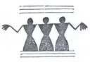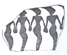شکل 5- قطعه یی سفال از تپه سیلک کاشان در این سفال چنانكه پیداست نوع و طرز دیگری از رقص نمایانده شده كه در آن رقصندگان پهلو به پهلو ایستاده، بازوان خود را از آرنج خم كرده، دستها بر روی دوش و كتف یكدیگر نهاده، به رقص و پایكوبی مشغولند (ش 6).