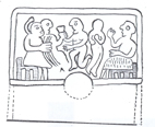 شکل 19- لوحه سنگی از شوش و در موزه لوور محفوظ است دو نقش برجسته در بالا و پایین حك شده كه نقش بالایی مجلس بزمی است كه در آن دو امیر در سمت راست و چپ بر روی چهار پایههایی نشستهاند و دو رقاصه در پیش آنها به رقص مشغولند. امیر سمت راست گویی برای تحسین و تشویق رقاصههایی كه در برابرش میرقصند، جام خود را بلند كرده آماده سركشیدن است و امیر سمت چپ كه از باده سرمست گشته، دست در كمر رقاصه انداخته، او را به آغوش خود كشیده است. ساقی مجلس نیز زانو زده جام باده را به دست رقاصه میدهد كه آن را تقدیم امیر مزبور بنماید. نقوش این قطعه سنگ حجاری شده با اینكه به علت ریختگی اندكی مبهم است ولی در هر حال، ارتباط رقصهای انفرادی را با مجالس بزم و شادی به خوبی نشان داده، تمایز رقصهای انفرادی شهوانی و تفریحی را با رقصهای دستهبندی مذهبی روشن میسازد. یكی دیگر از نمونه رقصهای این دوره بر روی قطعه سفالی است از «كاسو» یا «كاسی»ها كه در هزاره سوم پیش از میلاد در شمال ایلام در نواحی كرمانشاه و درههای كوههای زاگرس زندگی میكردهاند. در این سفال (ش 20) تصویر سه انسان در حال رقص در نزدیكی چادرها یا كلبههای نییشان، نشان داده شده است.