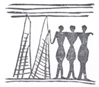 شکل 1- قطعه سفالی از تپه سیلک کاشان در روی این قطعه سفال كه پیداست خود بخشی از یك ظرف بزرگ است، نقش چهار زن در حال اجرای رقص دستهجمعی نموده شده است. از حالت این گروه كه اندكی از بسیارند، و طرز قرار گرفتن بازوان و بدنشان، و از توجهی كه به یك سمت دارند پیداست كه مشغول اجرای رقص مقدس مذهبی میباشند و چون این نقش در دورادور ظرف تكرار شده حلقه كاملی را تشكیل میداده است، بنابراین نمودار یك رقص دایرهوار است. اصولاً اجرای رقصهای دستهجمعی دایرهوار، كه در آن افراد قبیله پهلو به پهلو یا دست به دست و یا به ردیف پشت سر هم قرار گرفته حلقهیی تشكیل میدادهاند، خود گواه بر این است كه رقص به منظور تجلیل یا پرستش موضوعی قابل احترام و مطلوب از قبیل : آتش، بت، شكار، توده محصول و خرمن و درختان پربار و از اینگونه انجام میگرفته است (ش 2 و 3).