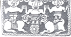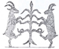شکل 22- تکه سفال نقش دار از تخت جمشید اجرای رقص با ماسك بز كوهی و شاخههای سبز درختی كه دارای برگهای متقارن باشد، ذهن انسان را بیاختیار به یك موضوع مذهبی از این دورهها منتقل میسازد كه نقش آن مكرراً بر روی ظروف و آثار دیگر آن دورهها نقاشی و حك شده است و آن تصویر دو بز كوهی (رمز خدای كوهستانها) به حالت ایستاده و نیمخیز در دو طرف «درخت زندگی» است كه دارای شاخهها و تزیینات متقارن است. این نقش یكی از موضوعات بسیار معمولی و متداول آن زمانهاست و یك عقیده مذهبی عمومی مردم آسیای غربی را بیان و توضیح مینماید (ش 23).