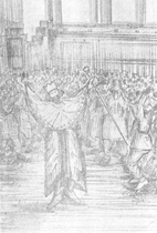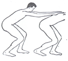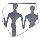 شکل 13 سفال دیگری كه از چشمهعلی به دست آمده و مربوط به 3600 پیش از میلاد است و اینك جزو مجموعه آقای محسن مقدم است، نمونه جالب دیگری از رقصهای دستهجمعی را نشان میدهد. در این سفال تصویر دو نفر كه با غلب احتمال زن هستند، به حالت رقص نمایانده شده است و حركات بدن و بازوان و آزادی دستها طرز رقصی را بیان میدارد كه در آن حركاتی اجرا میشده كه گرفتن دستها را غیرممكن میساخته است و شاید حالت مذكور مقدمه رقص نمونه (b) است كه در آن دست و بازوی رقصندگان در بالا به طور آزاد قرار گرفته است (ش 14).