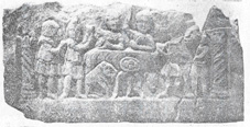 شکل 32- بگمازیا عشای ربانی مهرپرستان، نقش برجسته، موزه سرا جوو در یوگسلاوی در نقش برجستهایی از معبد مهر كه در كونیتس (Konjic) در بسنی یوگسلاوی كشف شده واكنون در موزه «سرا جوو» محفوظ است چنین دیده میشود كه در تالاری كه سقف آن بر روی ستونهای مارپیچی قرار گرفته است، دو نفر ازواقفان اسرار (= Myste = مهران) بر روی تشكی پر از بالش دراز كشیدهاند و در پیش آنها بر روی سهپایهیی نانهای مذهبی و مقدس «درئونه» كه شكل صلیب روی آنها كشیده شده نهادهاند، در طرف چپ میز شیری چمباتمه زده و در طرف راست آن كله قوچی قرار دارد. در دو سوی نقش برجسته چهار تن از سالكان كه صورتك (ماسك)های مخصوص درجهیی كه بآن رسیدهاند بر چهره نهادهاند، ایستادهاند، بدینگونه كه در طرف چپ «كلاغ» و «پارسی یا پارسا» كه با شلق ایرانی بر سر دارد دیده میشوند و جام شرابی از شاخ (ریتون) در دست دارند. در طرف چپ «شیر» و «سرباز» دیده میشوند كه متاسفانه صورت و ماسك نفر آخری بعلت شكستگی ناپیداست.