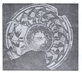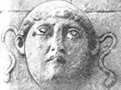 شکل 37- ماسک از دیوار ایوان جنوبی کاخ اشکانی در الحضرا و چنانكه گذشت، اغلب این رقصها با نهادن ماسكها و صورتكهای مختلفی برچهره انجام میگرفته است. در تایید وجود و استعمال ماسك در دوره اشكانی بجاست یادآوری كنیم كه بر روی دیوار ویرانههای كاخی عجیب در الحضر (هاترا) در پنجاه میلی غرب موصول كه ظاهراً تنها باقی مانده از یك شهر بزرگ اشكانی است، مقداری ماسك بشكل و قیافههای مختلف آدمی، از سنگ حجاری و بدیوار نصب شده كه رواج آنرا در مراسم مذهبی آن زمان بثبوت میرساند و با اشاراتی كه در كتاب فوق دایر بر استعمال ماسك آمده است، كاملاً تطبیق مینماید و فیالجمله ادامه استعمال ماسك را در مراسم مذهبی- كه نمونه آنرا در نقوش ماقبل تاریخ مكشوف در تخت جمشید مشاهده كردیم (قسمت اول این مقاله در مجله موسیقی شماره 80-79)- تا این عهد و زمان، در ایران نشان میدهد.