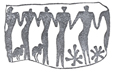 شکل 10- سفالینه هایی از تپه موسیان روی قطعه (a) كه گویا قسمتی از ظرفی است كه در دورادور آن این نقش تكرار میشده، گروهی در حال رقص «دستهبند» نموده شدهاند كه در پیشاپیش آنان كوكبهایی رسم گردیده كه از لحاظ دال برهای داخل دایره، بسیار شبیه به نقش وسط ظرف سفالین قبلی است و در اینجا نیز احتمال میتوان داد كه منظور از آن نمایش خورشید یا خرمن محصولات بوده است. در این تصویر نیز رقصندگان، عریان و بدون تنپوش نشان داده شدهاند و از طرز حركات دست و بازوان معلوم میشود كه اجراكنندگان، بر خلاف حالات قبلی برای تشكیل حلقه رقص با خم كردن بازوان خود از آرنج، دستها یا انگشتان كوچك یكدیگر را در بالا، محاذی شانههای خود، میگرفتهاند. این نوع رقص هنوز در میان ارمنیها و آشوریهای ایرانی و كردها معمول است(ش 11).