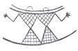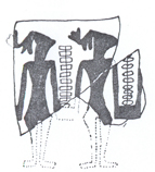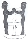 شکل 13 سفال دیگری كه از چشمهعلی به دست آمده و مربوط به 3600 پیش از میلاد است و اینك جزو مجموعه آقای محسن مقدم است، نمونه جالب دیگری از رقصهای دستهجمعی را نشان میدهد. در این سفال تصویر دو نفر كه با غلب احتمال زن هستند، به حالت رقص نمایانده شده است و حركات بدن و بازوان و آزادی دستها طرز رقصی را بیان میدارد كه در آن حركاتی اجرا میشده كه گرفتن دستها را غیرممكن میساخته است و شاید حالت مذكور مقدمه رقص نمونه (b) است كه در آن دست و بازوی رقصندگان در بالا به طور آزاد قرار گرفته است (ش 14).