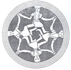 شکل 1- قطعه سفالی از تپه سیلک کاشان در روی این قطعه سفال كه پیداست خود بخشی از یك ظرف بزرگ است، نقش چهار زن در حال اجرای رقص دستهجمعی نموده شده است. از حالت این گروه كه اندكی از بسیارند، و طرز قرار گرفتن بازوان و بدنشان، و از توجهی كه به یك سمت دارند پیداست كه مشغول اجرای رقص مقدس مذهبی میباشند و چون این نقش در دورادور ظرف تكرار شده حلقه كاملی را تشكیل میداده است، بنابراین نمودار یك رقص دایرهوار است. اصولاً اجرای رقصهای دستهجمعی دایرهوار، كه در آن افراد قبیله پهلو به پهلو یا دست به دست و یا به ردیف پشت سر هم قرار گرفته حلقهیی تشكیل میدادهاند، خود گواه بر این است كه رقص به منظور تجلیل یا پرستش موضوعی قابل احترام و مطلوب از قبیل : آتش، بت، شكار، توده محصول و خرمن و درختان پربار و از اینگونه انجام میگرفته است (ش 2 و 3).