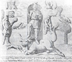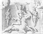شکل 31- میترا هنگام قربانی گاو در زیر دست و پای گاو نر، مار و عقرب و در برابر او سگ تازی دیده میشود ولی اشكال و رموز معبد منحصر باینها نبوده، انواع صورتها و نقوش سمبلیك از قبیل ماده و خورشید و گیاهان و پرندگان و جانوران و ادوات مختلف دیگر كه از هر كدام آنها معنی خاصی اراده میشده بر در و دیوار معبد نقش میگردیده است. «در آیین مهر، هفت درجه و مقام تقدس قایل بودهاند و برای دخول بهریك از درجات، شست و شوی مخصوص لازم بوده است و ماخذ غسل تعمید عیسویان همین است. در هر یك از روزهای هفته درجایی معین از معبد از ستاره مخصوص همان روز استغاثه میشده و روز یكشنبه را كه مخصوص بخود خورشید بود، مقدس میشمردهاند. پیروان مهر برای اینكه بدرجات بالاتر ارتقاء یابند میبایست عبادتها و ریاضتهایی بجا آورند، چشمانشان را میبستند و دستشان را با روده ماكیان بهم میپیوستند و بدینگونه میبایست از فراز گودالی كه پر از آب بود بجهند تا نجات دهندهیی بیاید و این بندها و علائق را بگشاید. هر یك از این درجات نامی داشت و گذشتن از درجهیی بدرجه دیگر ریاضت و عبادت و شایستگی میخواست. ترتیب درجات و نامهای آنها بدینگونه بود: 1- كلاغ سیاه (غراب) 2- پنهان یا بیوك (عروس) 3- سرباز یا سپاهی 4- شیر 5- پارسی یا پارسا 6- پیك خورشید یا آفتابگاه 7- پدر در جشنها و مراسم نیایش، نقاب یا ماسكهایی بچهره میزدند كه معرف این درجات بود».