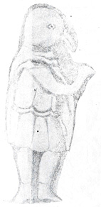 شکل 18- مجسمه مفرغ از دماوند حالت و طرز قرار گرفتن بازوان این مجسمه مفرغی ما را به یاد رقصهای انفرادی كه هنوز هم در اغلب نقاط ایران متداول است میاندازد. با توجه به اینكه رقصهای انفرادی در آن روزگاران بسیار به ندرت انجام میگرفت و شاید تنها زنان و رقاصههای زیباروی بودند كه برای تفریح خاطر رؤسای قبایل و صاحبان قدرت به رقصهای شهوانی انفرادی اقدام مینمودند، این قطعه مفرغ دومین نمونه از این گونه رقصها میتواند به شمار آید، زیرا در یك قطعه لوحه سنگی مربع شكل سوراخداری نیز كه در شوش به دست آمده (ش 19)